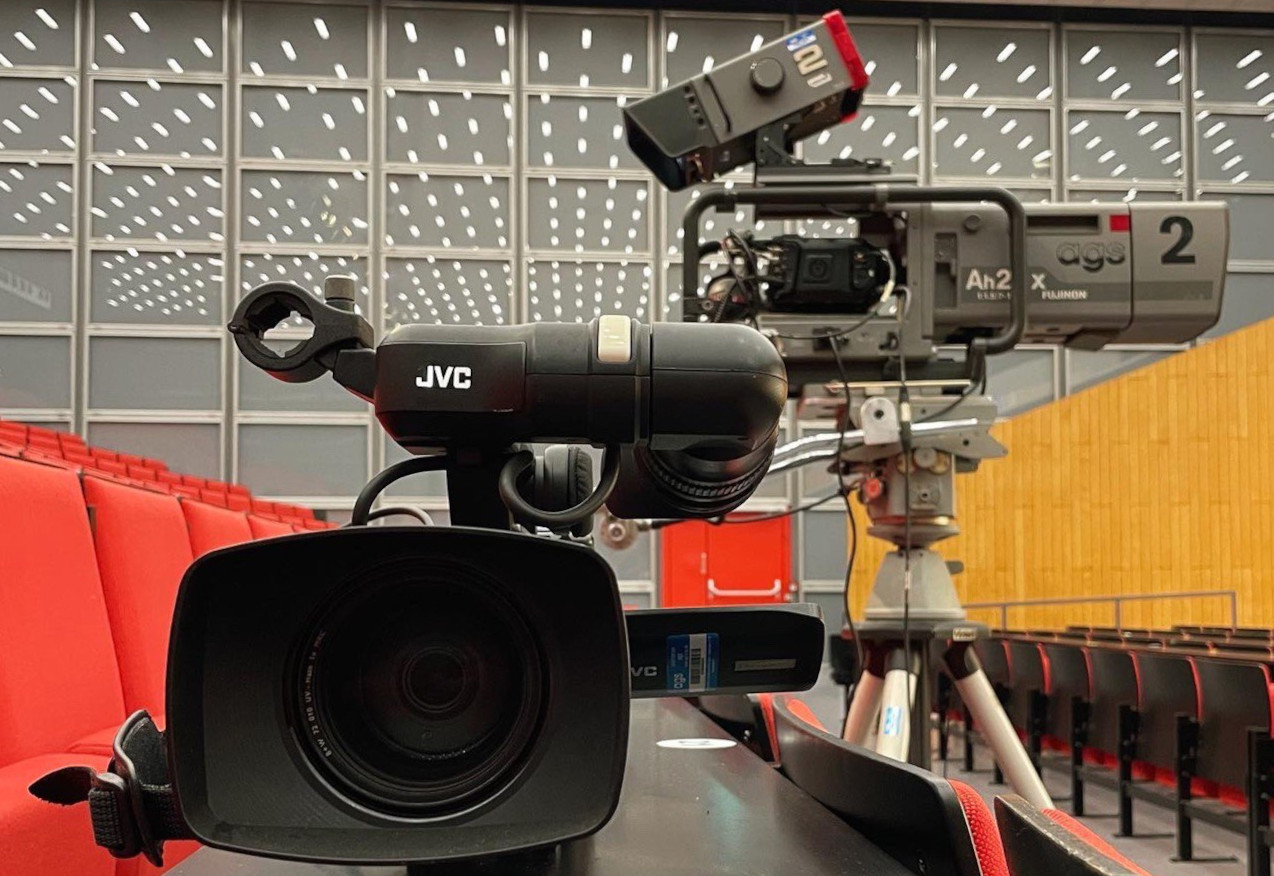 Zum einen konnten wir zum ersten Mal beide unsere auf Glasfaser umgebauten Large-Lens-Adapter zusammen mit den alten Boxoptiken und unseren neuen Kameras verwenden. Somit waren selbst kleinste Details, die Prof. Scholl in die Kamera hielt, kein Problem. Zusätzlich hatten wir noch unsere EB-Kamera mit einer Videofunkstrecke im Einsatz um den Eltern die Atmosphäre im Audimax besser näherbringen zu können.