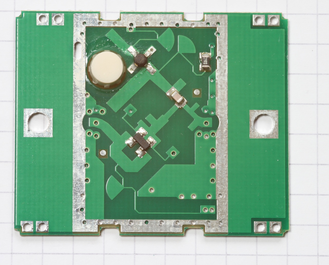 Das Modul besteht aus einem 10 GHz Oszillator, zwei Patchantennen-Paaren für Sende- und Empfangsrichtung, und einem Mischer. Sehr wahrscheinlich handelt es sich um einen einfach balancierten Mischer aus zwei Dioden. Für uns eine günstige Gelegenheit, etwas über Mikrowellen-Schaltungstechnik zu lernen.