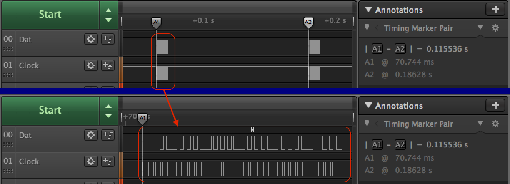Der Messschieber sendet ein Paket mit den Positionsdaten ca. alle 115ms. Betrachtet man dann dieses Datenpaket genauer, erkennt man, dass es aus 24 Bit , also 3 Byte, besteht. Ein High-Pegel am Clock-Signal signalisiert ein gültiges Bit auf der Data-Leitung (Während des High-Pegels auf Clock ändert sich somit das Data-Bit auch nicht). Durch ausprobieren verschiedener Stellungen der Messschieber und Analyse des Datenpakets auf dem Oszilloskop kann relativ einfach die Codierung des Datenpakets ermittelt werden. Man erkennt relativ schnell, dass die ersten 20 Bit den Betrag der aktuellen Position in 1/100mm darstellen und dass das 21 Bit das Vorzeichen-Bit ist. Das 24. Bit steht für den aktuellen Modus (mm/inch) wobei inch in unseren Längengraden weniger gebräuchlich und deshalb in diesem Projekt nicht mit implementiert ist.