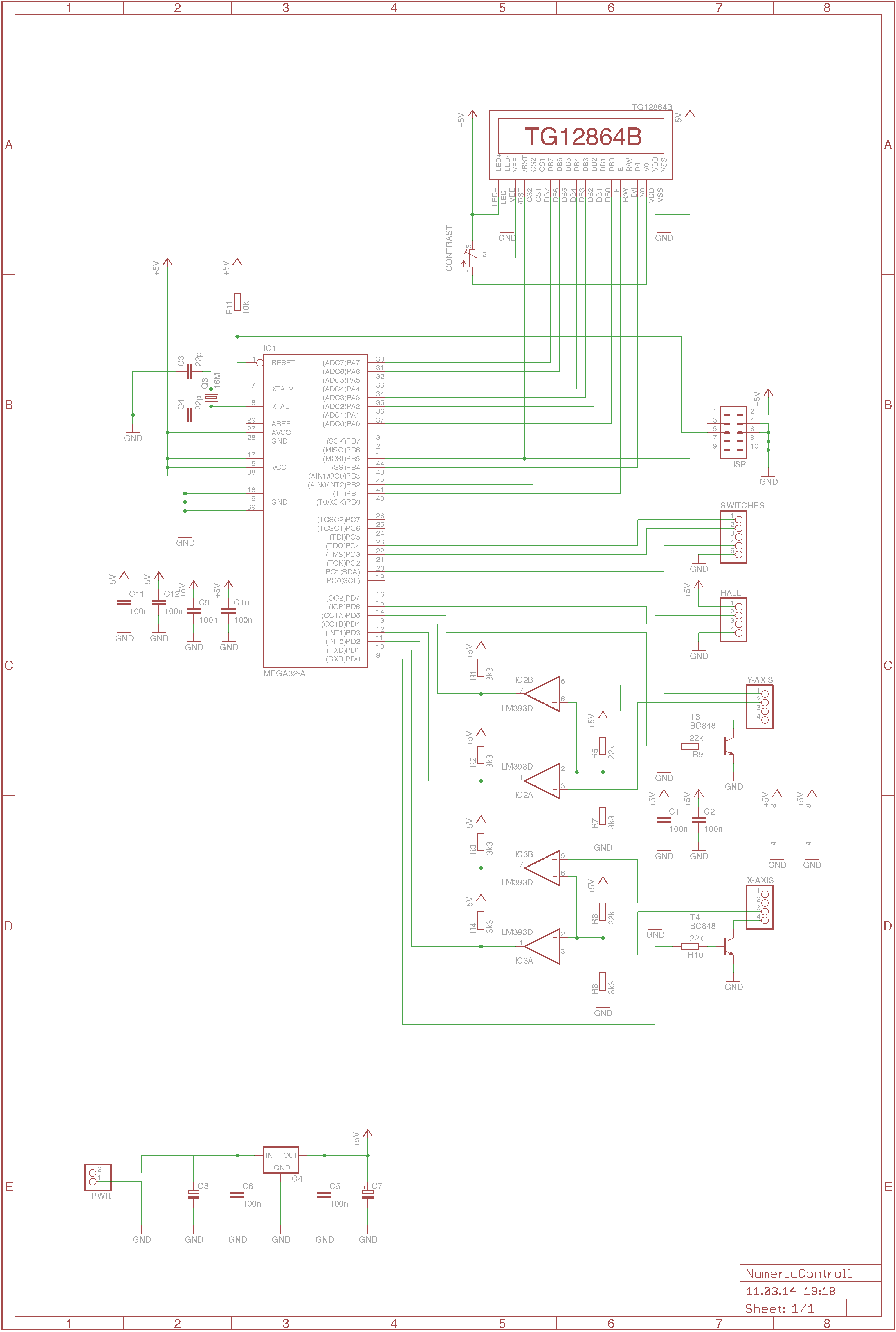 Im Prinzip handelt es sich hier um eine einfache Mikrocontroller-Grundschaltung mit einem GLCD ( Pollin TG12864B), Datenbits angeschlossen auf Port A und Steuerleitungen auf Port B. Der Hallsensor ist an einem beliebigen freien Portpin angeschlossen und wird über den Pin-Chance Interrupt des Mega644 ausgelesen. Zur Pegelanpassung der Signale vom Messschieber wird ein einfacher LM293 OP-Amp verwendet, der als Komparator verschaltet ist, das ganze pro Messschieber 2 mal für Clock und Data. Zusätlich dazu jeweils noch ein Transistor der die Zero-Leitung vom Anbaumessschieber auf GND, zur Nullung der Anzeige, auf GND zieht. Alle Anschlüsse sind jeweils auf Pinheader herausgeführt.