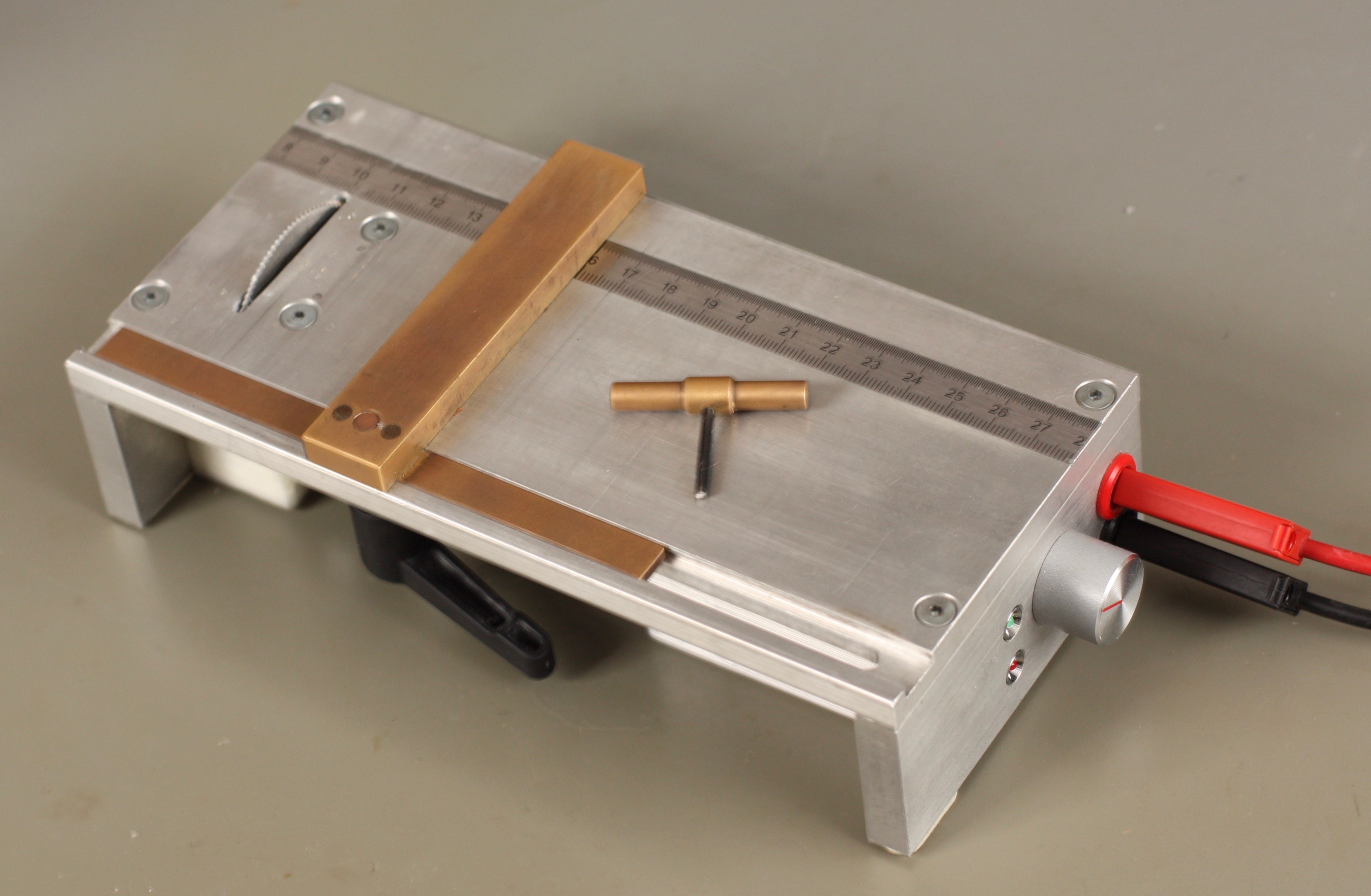 Platinensäge mit verstellbaren Messinganschlag und ein in den Tisch eingelassenen Stahllineal erlaubt millimetergenaue saubere Schnitte.
